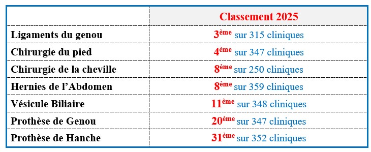 La Clinique du Cèdre se classe en très bonne position au niveau national pour sept de ses spécialités.